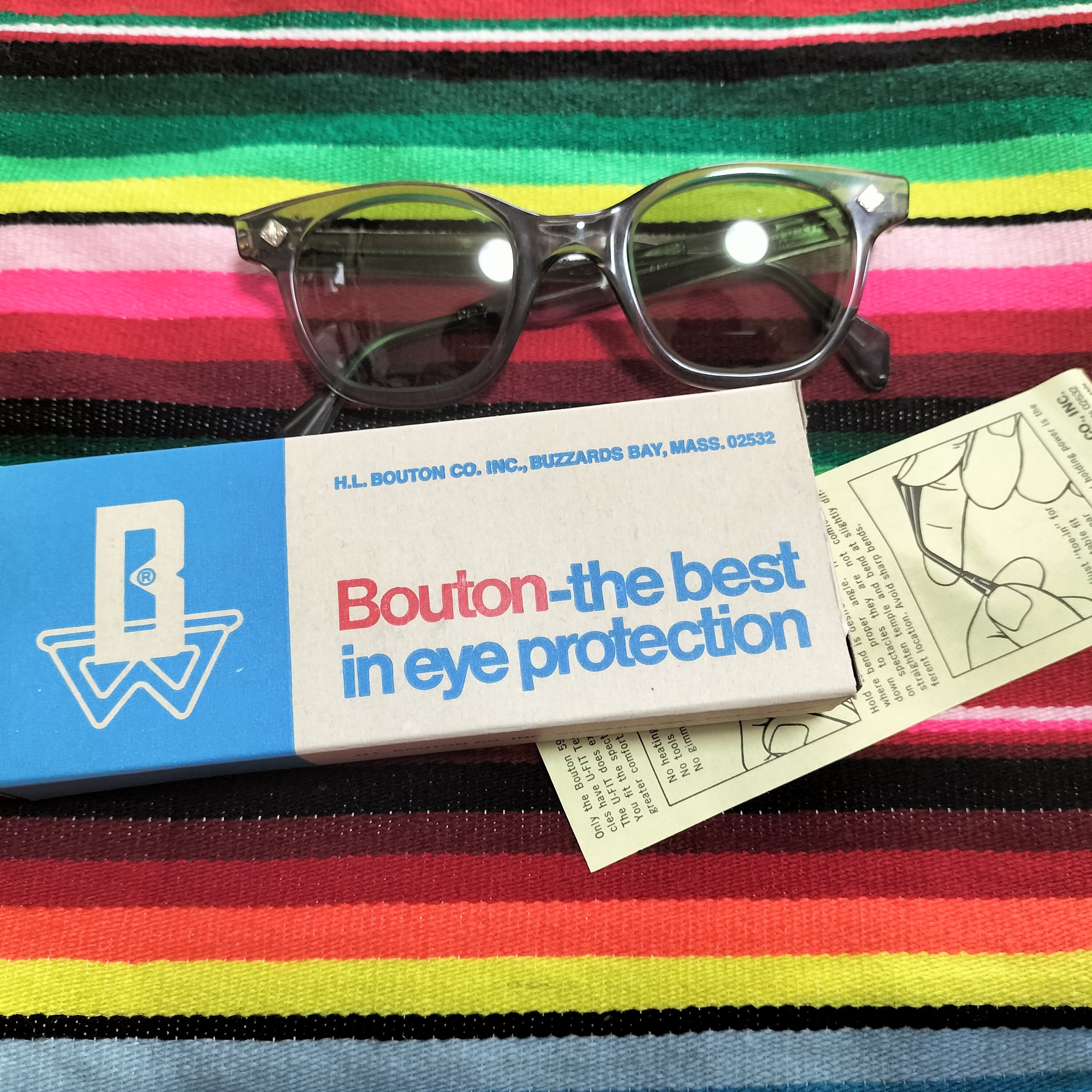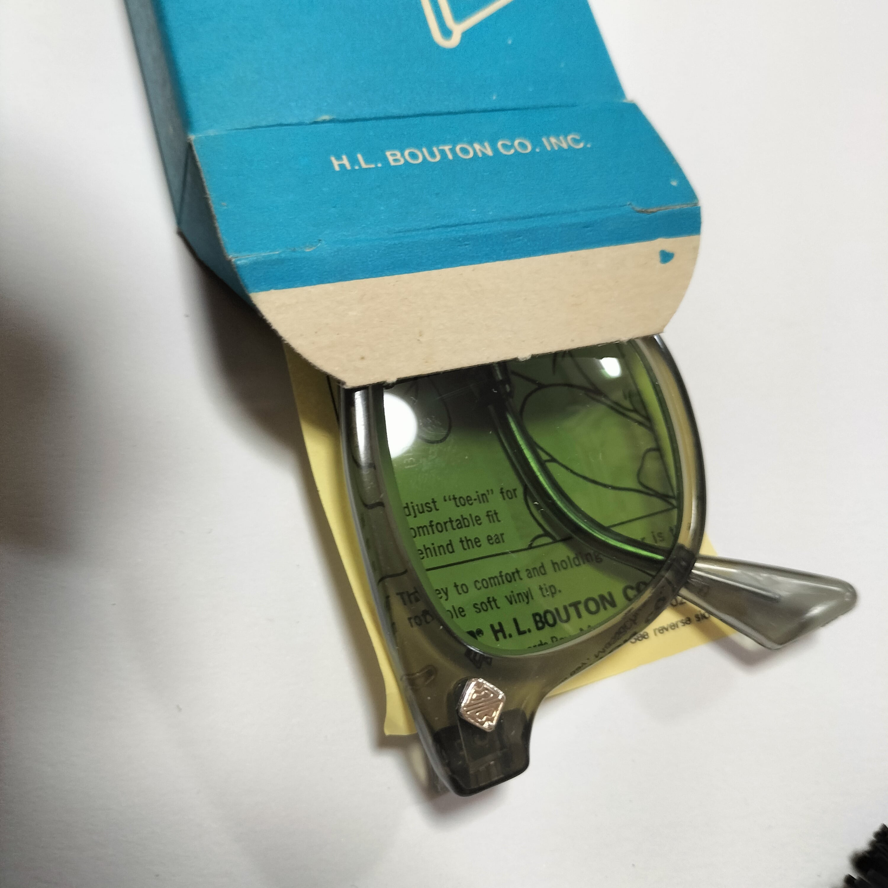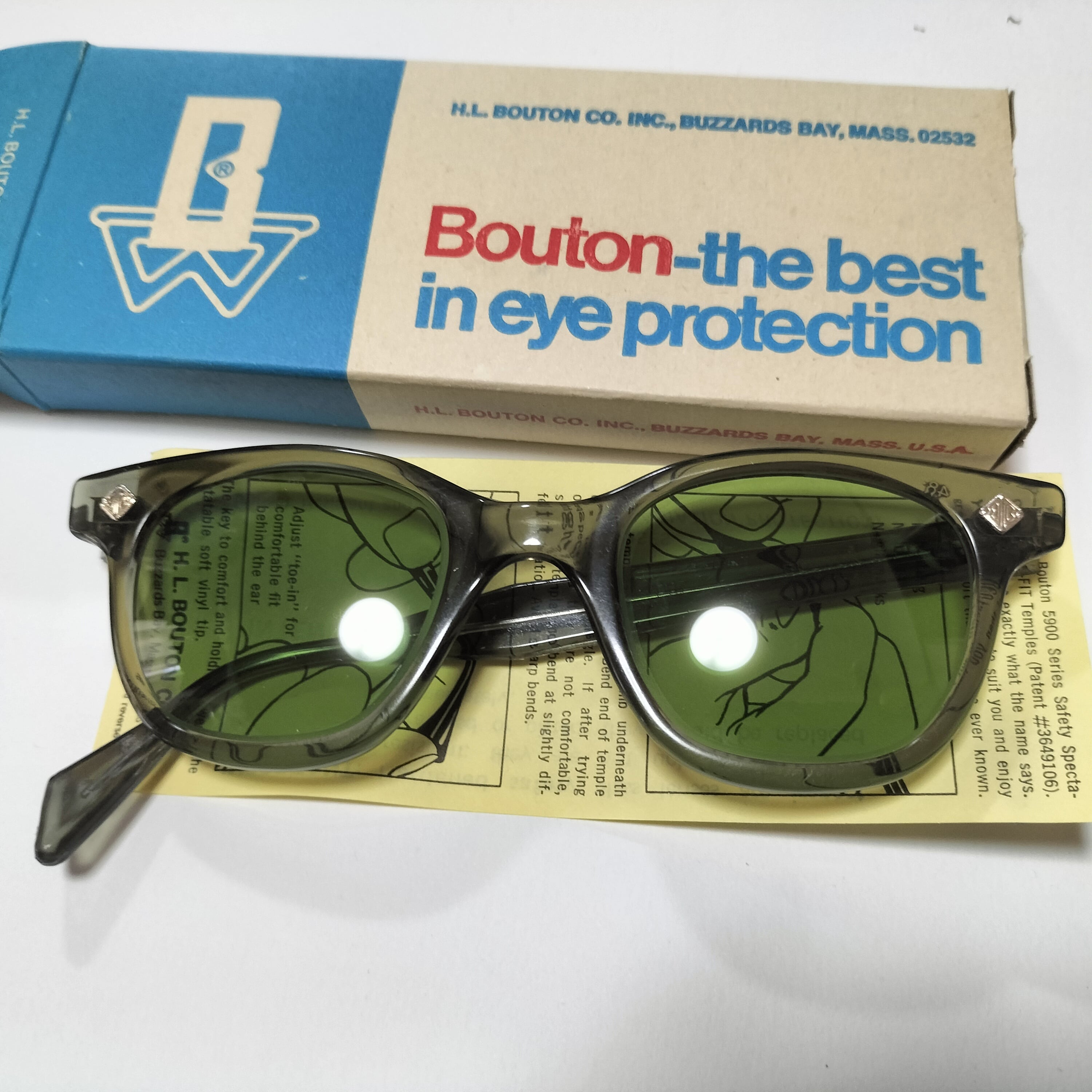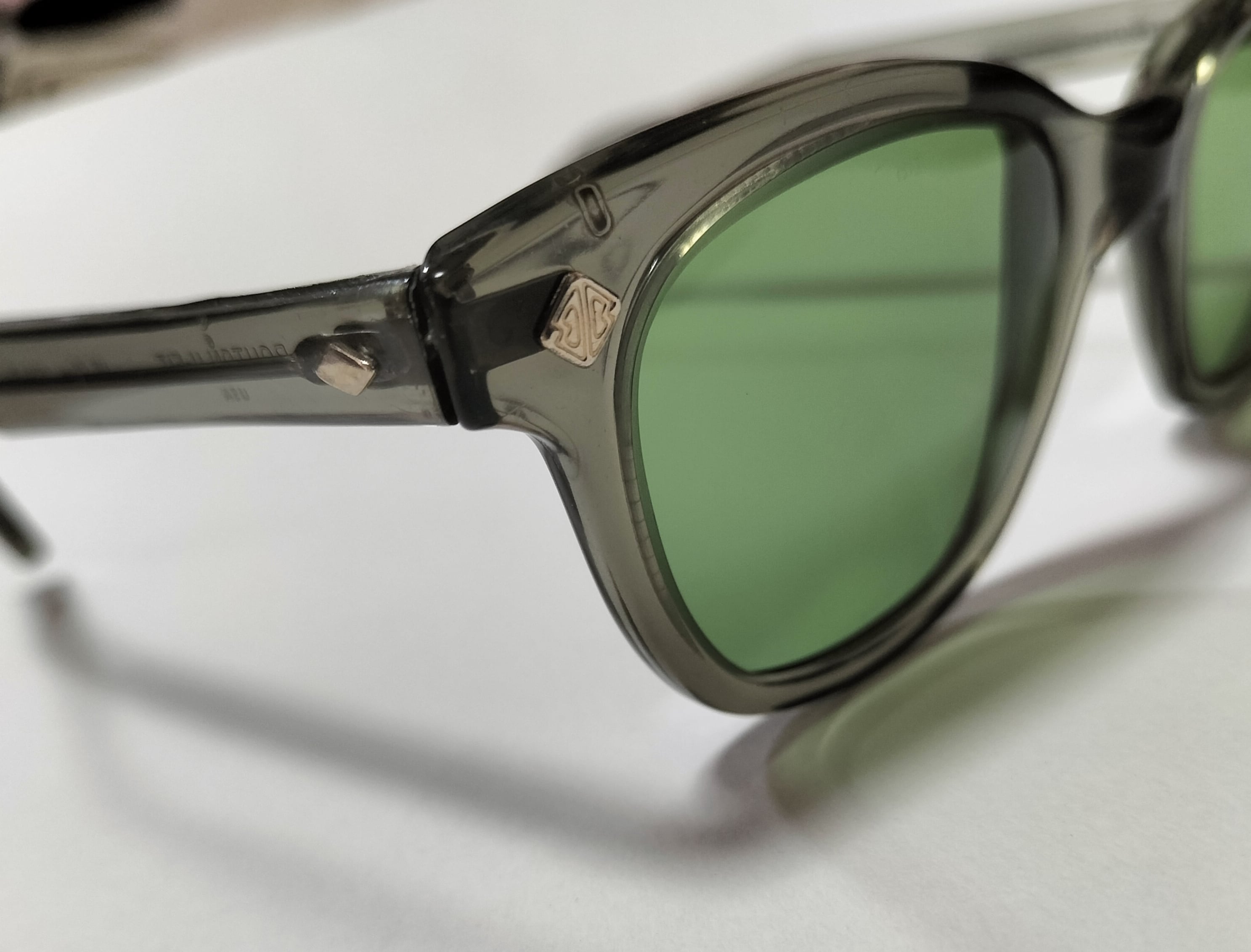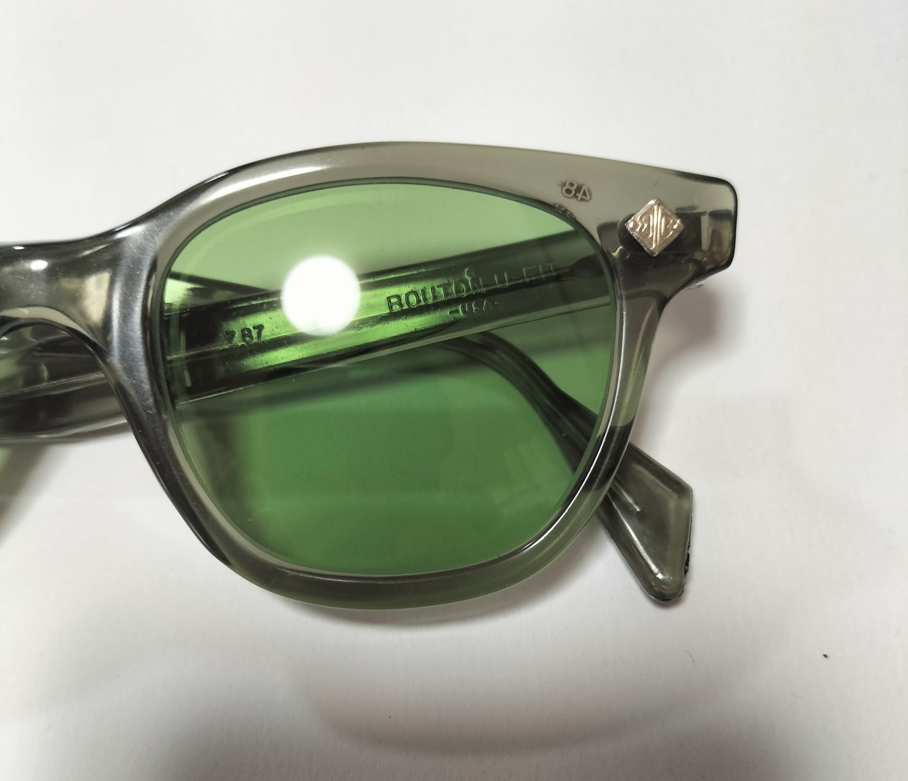 1966-70年製造、アメリカBouton 社製U FITビンテージ眼鏡になります。独特のグラマラスなフロントフレームライン。U FIT の名の通り、ノーズ部分がUの字にシェイプされておりピッタリと鼻にフィット、非常に良い掛け心地の名作です。 デッドストックのミントコンデション。Bの字が砂打ちされた当時のオリジナルガラスレンズ、フレーム部分に傷等は見当たらないレアな一品になります。フレームカラーはクリアグレイ。独特のグラマラスなフロントフレームラインが特徴です。