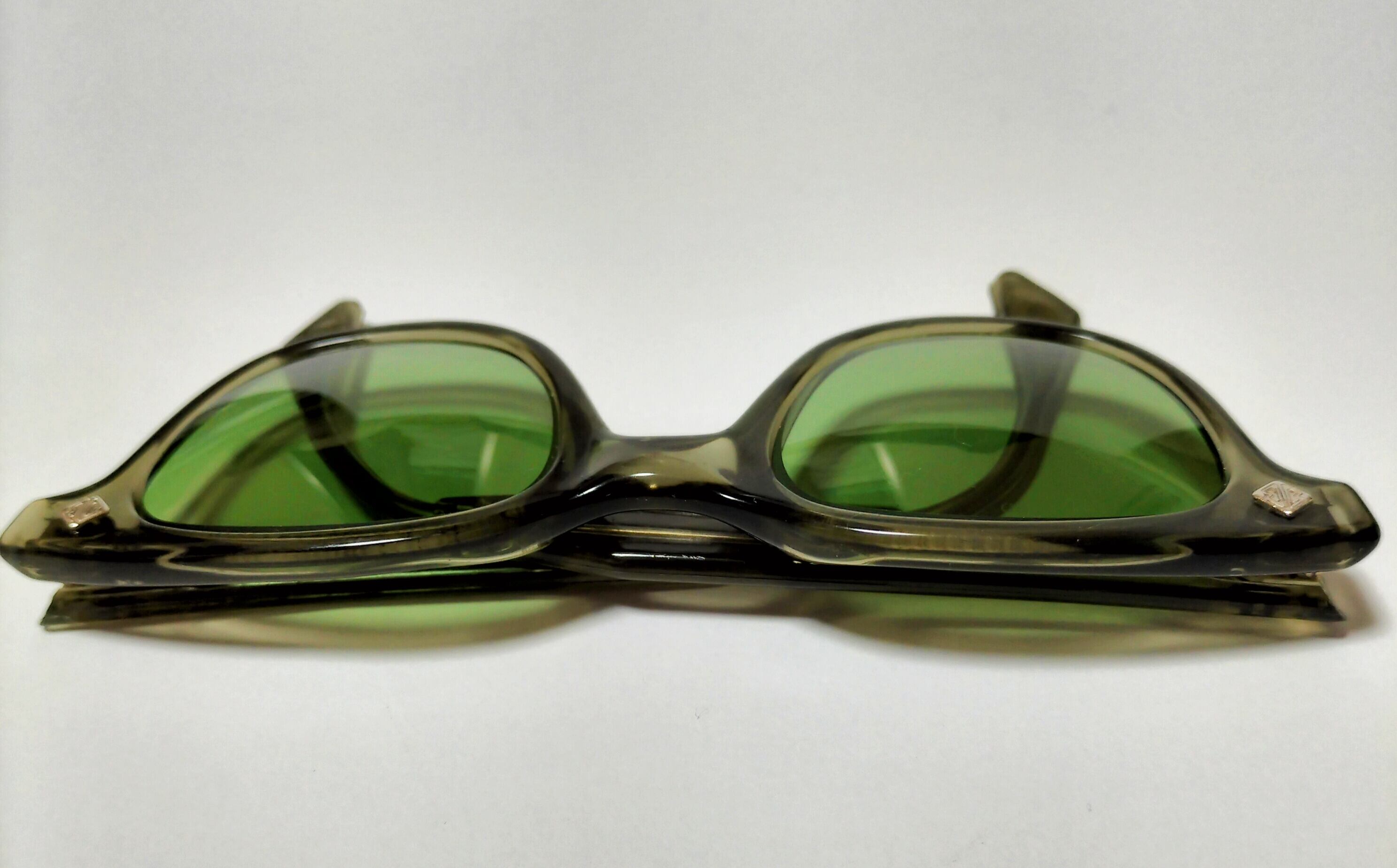 アメリカBouton 社製ビンテージ眼鏡になります。フレームカラーはクリアオリーブ。独特のグラマラスなフロントフレームラインが特徴です。レンズは当時の度なしダークグリーンオリジナルガラスレンズが装着されています。(BOの砂打ち刻印アリ)
