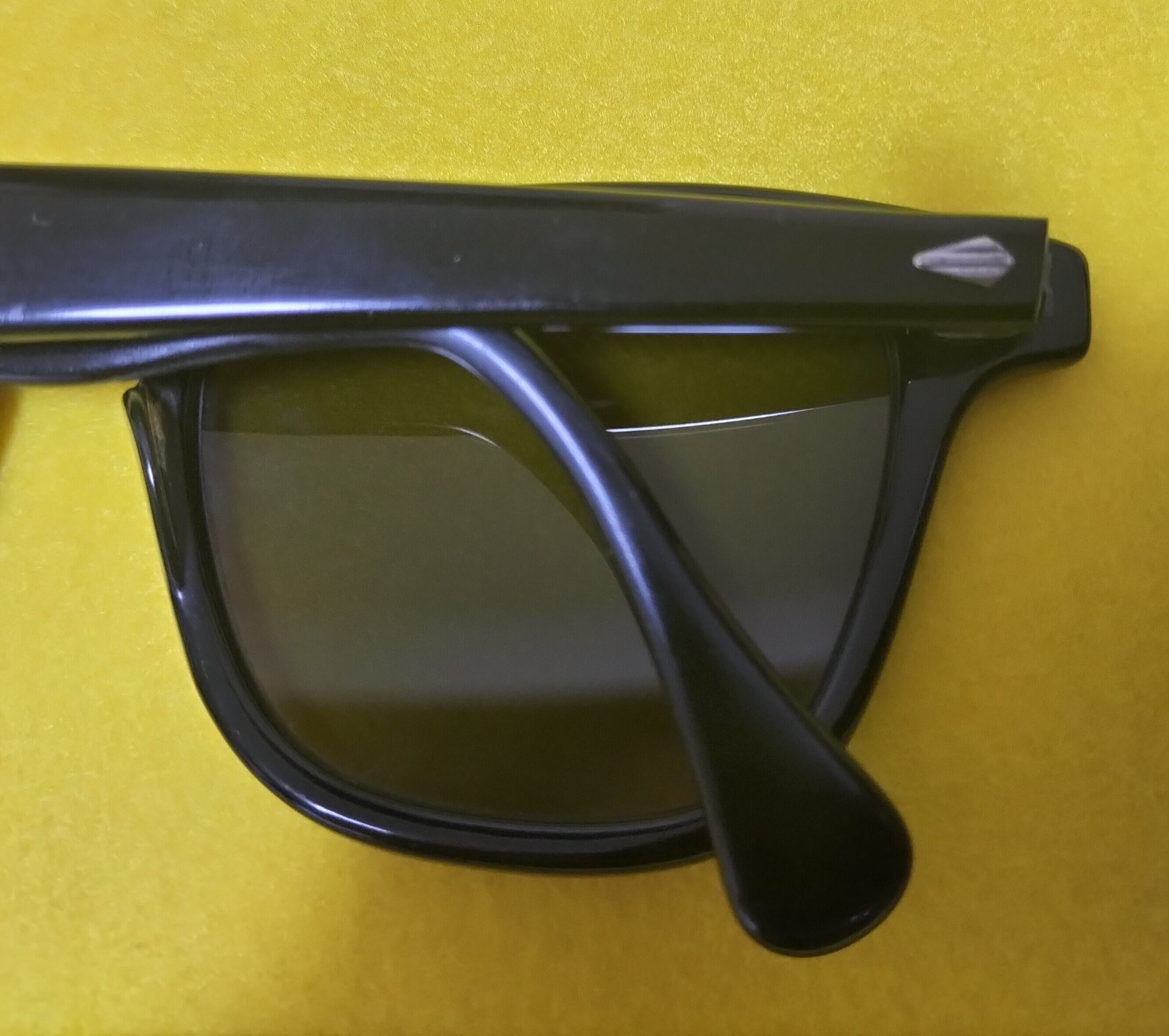 お探しの方もいらっしゃるのではないでしょうか?フォルムはアメリカンオプティカルのサラトガをベースに製作されたのではと推測致します。フレームはブラック。度なしのダーク系レンズが装着されています。丁番金具の刻印デザインやフレームの質感、アメリカンビンテージフレームの香り際立つ1品。