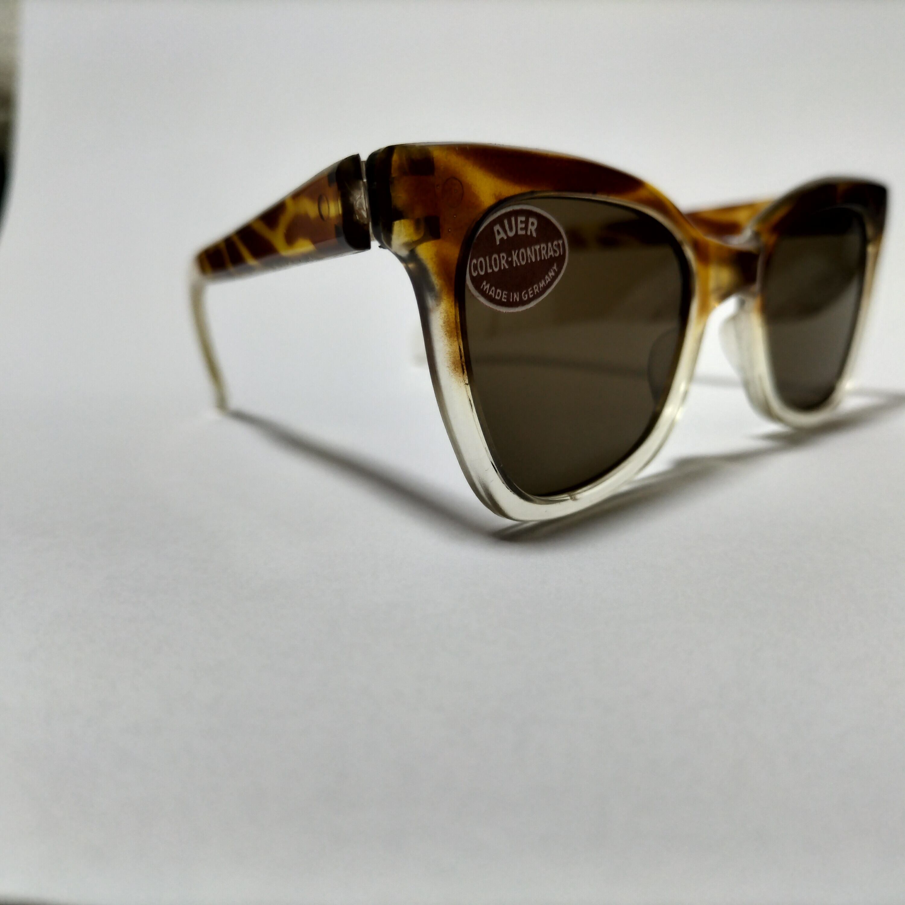 フロントフレームはブラウン系の縞柄とクリアホワイトのツートン。ダークな色合いのレンズとの絶妙なグラデーション!キャンディな風合いを放っていますね。