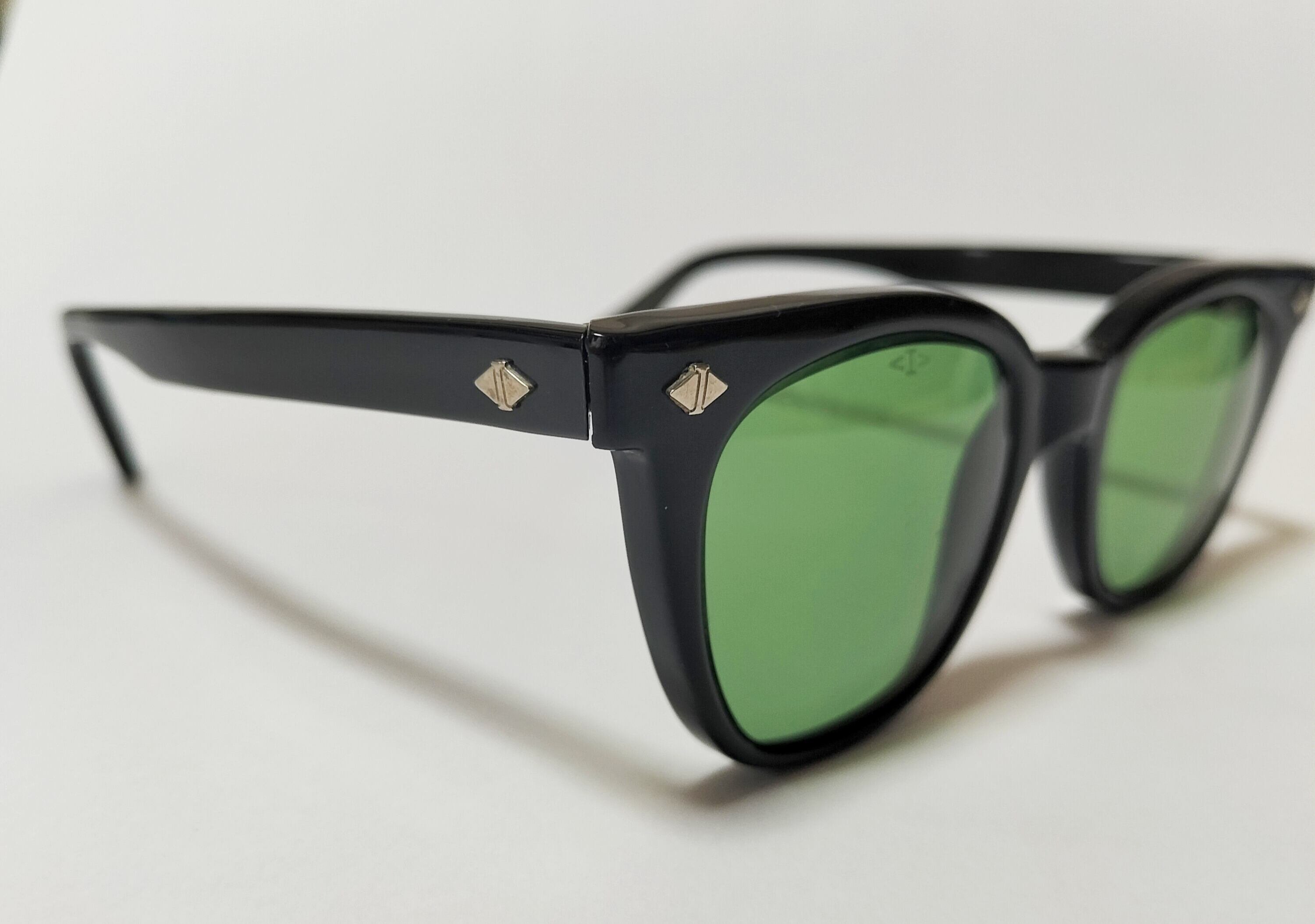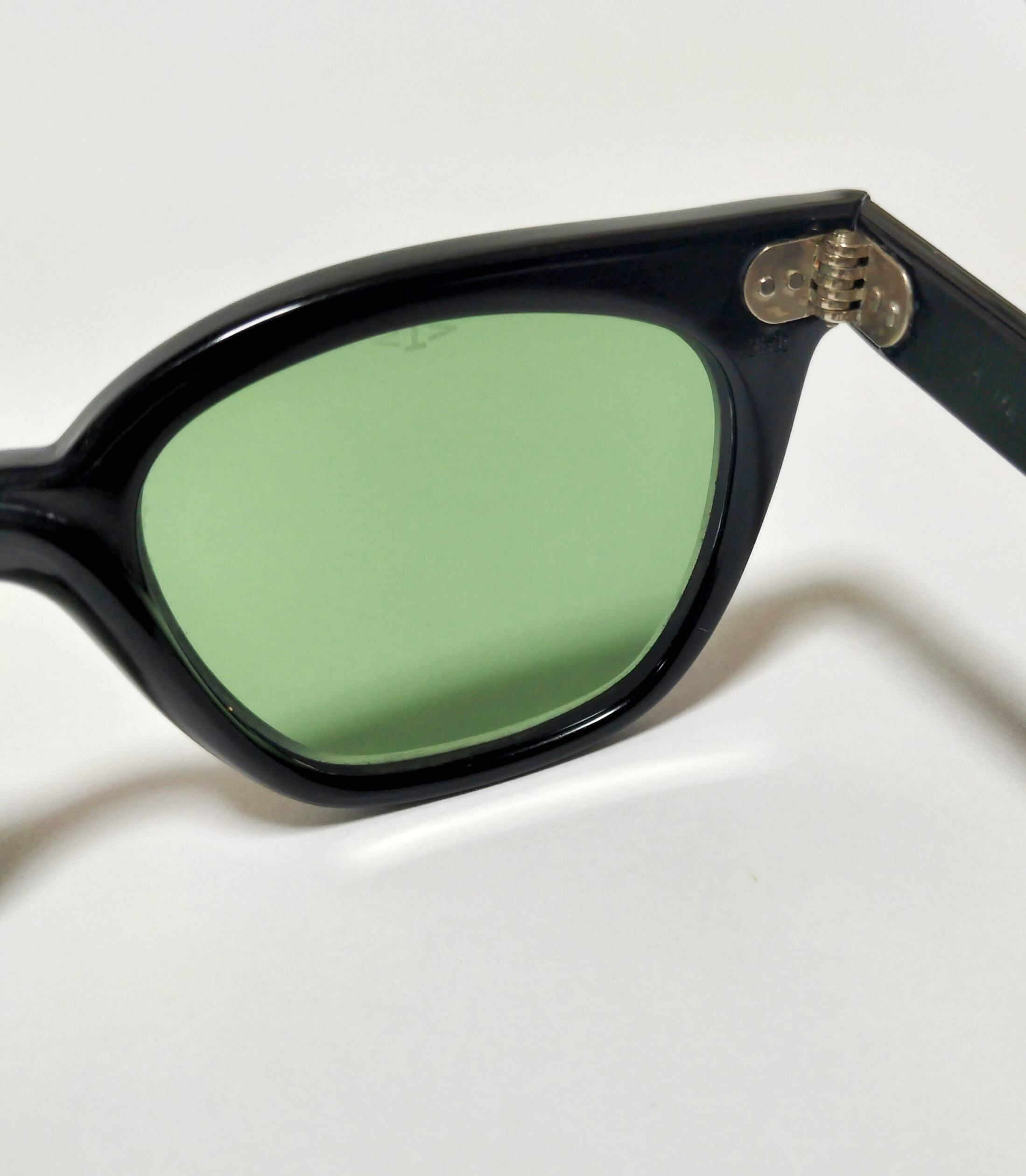 ダイヤ型のヒンジで飾られたブラックフレームも黒壇特有の深い光沢感があり、グリーンレンズとの相性も大変良いと思います。右側テンプルの耳部分に少し細かなスレがあります。写真参照になさって下さい。大変レアで貴重な一品、是非!